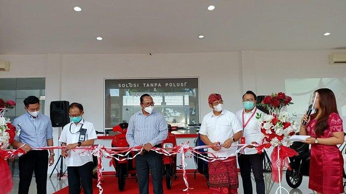 Grand opening ditandai dengan pemotongan pita dan dilanjutkan dengan menyalakan serta membunyikan klakson dari empat sepeda motor listrik yang disiapkan.